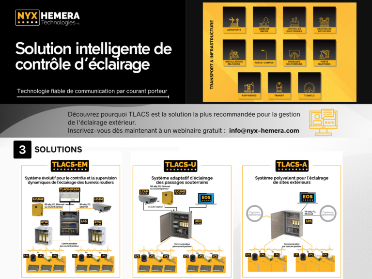 💡 L’éclairage intelligent est essentiel pour garantir des infrastructures sûres et sécurisées. Le TLACS de Nyx Hemera Technologies est une solution clé en main qui a déjà été installée dans plus de 200 projets à travers le monde. Les opérateurs d’infrastructures nous font confiance en raison des nombreux avantages qu’offrent nos solutions.