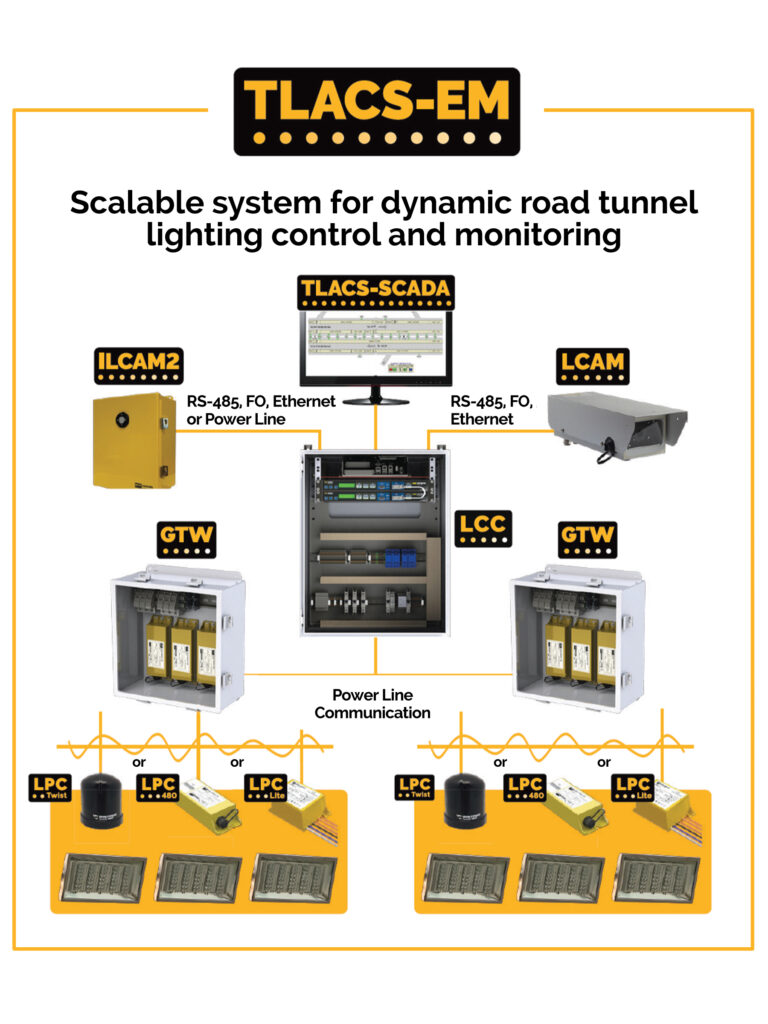 TLACS-EM is adaptable to the needs and requirements of road tunnel lighting control. Using power line communication, Nyx Hemera Technologies applies advanced methods that combine techniques based on different frequencies and transmission speeds, achieving ultra-robust communication on power lines. This solution has been installed in over 175 tunnels worldwide.