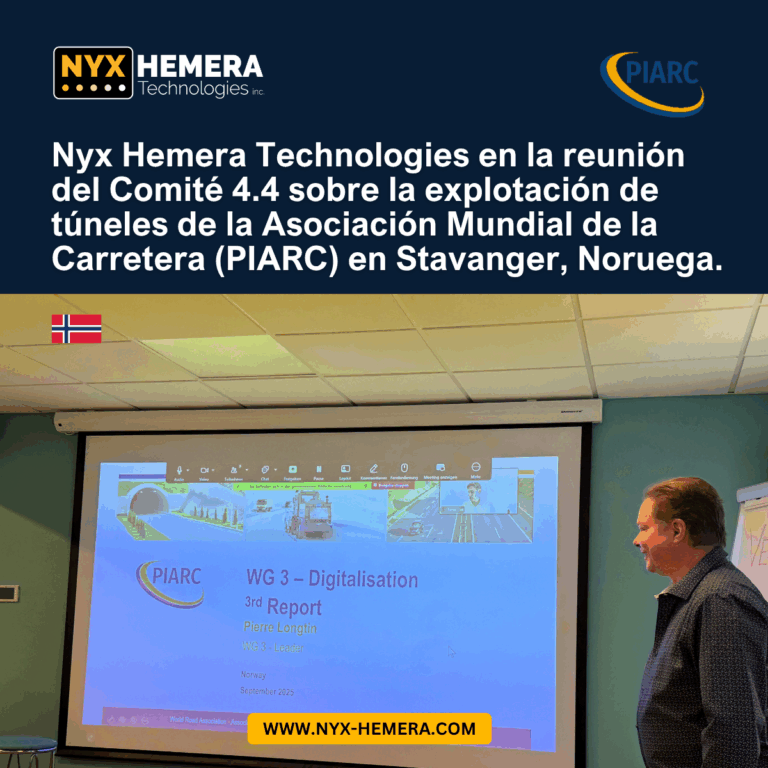 Pierre Longtin, presidente de Nyx Hemera Technologies, y Line Lacroix, directora de Ventas y Marketing, se encuentran esta semana en Stavanger, Noruega, para participar en una reunión del Comité 4.4 sobre la explotación de túneles de la Asociación Mundial de la Carretera. Como responsable del grupo de trabajo 4.4.3 sobre digitalización, Pierre presentará los resultados de una encuesta y de estudios de casos sobre la digitalización en túneles recopilados entre miembros que representan a más de 35 países miembros, con el objetivo de publicar un informe sobre el tema antes de que finalice el mandato del Comité en 2027.